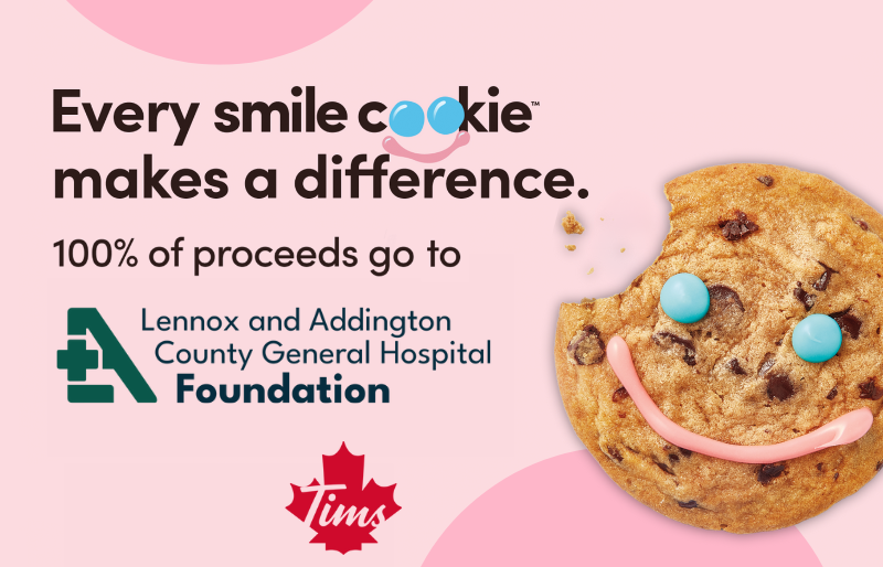 From April 27th to May 3rd, purchase your Smile Cookie at one of the three participating Tim Hortons locations in Napanee and help keep healthcare close to home in Lennox and Addington!